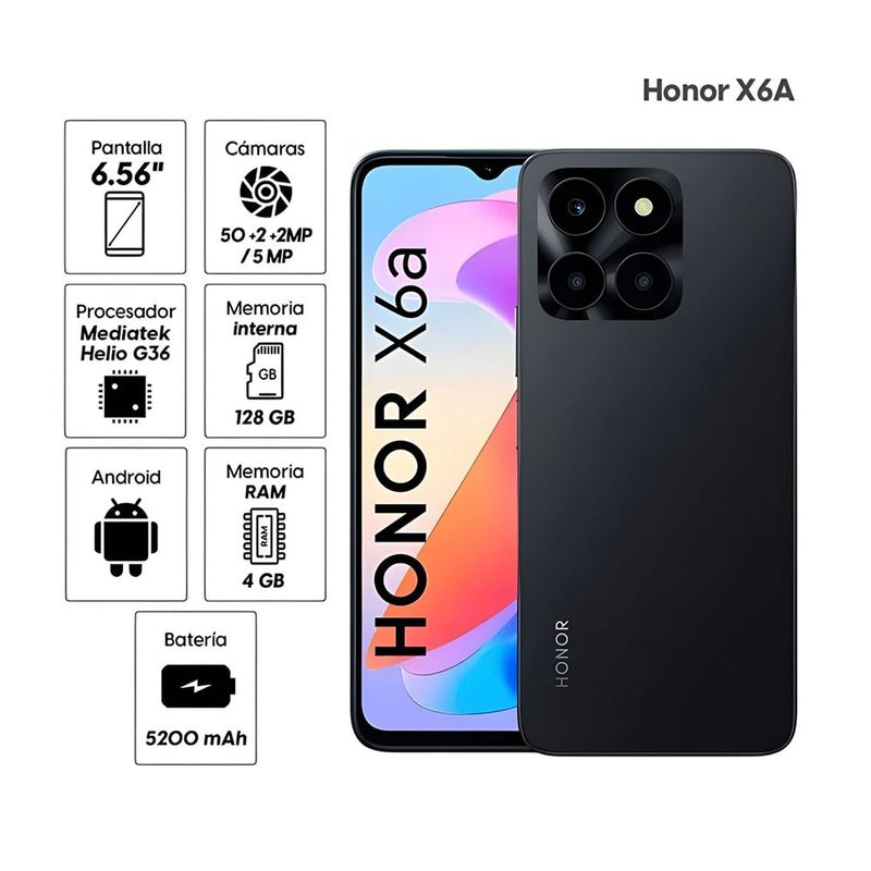 El celular Honor X6A ofrece un rendimiento potente con 128GB de almacenamiento y 4GB de RAM.
